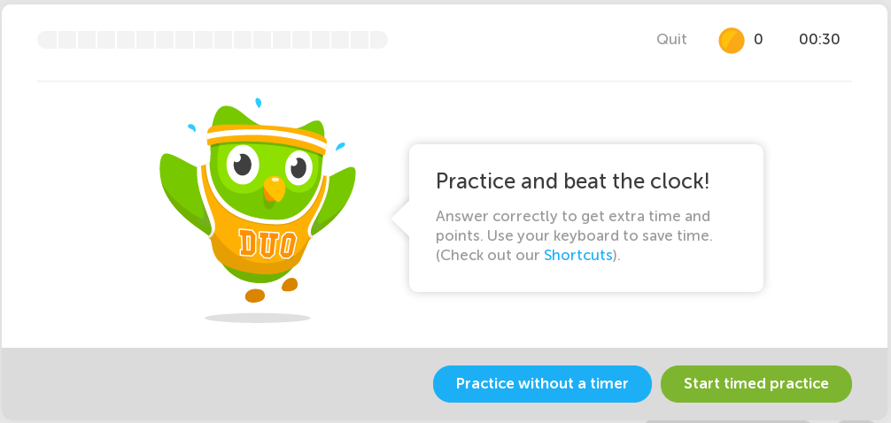Practice without a timer, or untimed practice for short, is the default practice mode when strengthening skills and remains an option after timed practice has been purchased in the Lingot Store. Completing the practice results in a gain of XP. XP earned varies on strength of skill before practice.